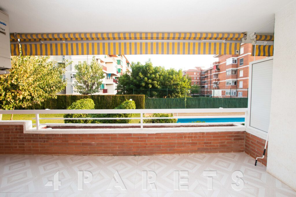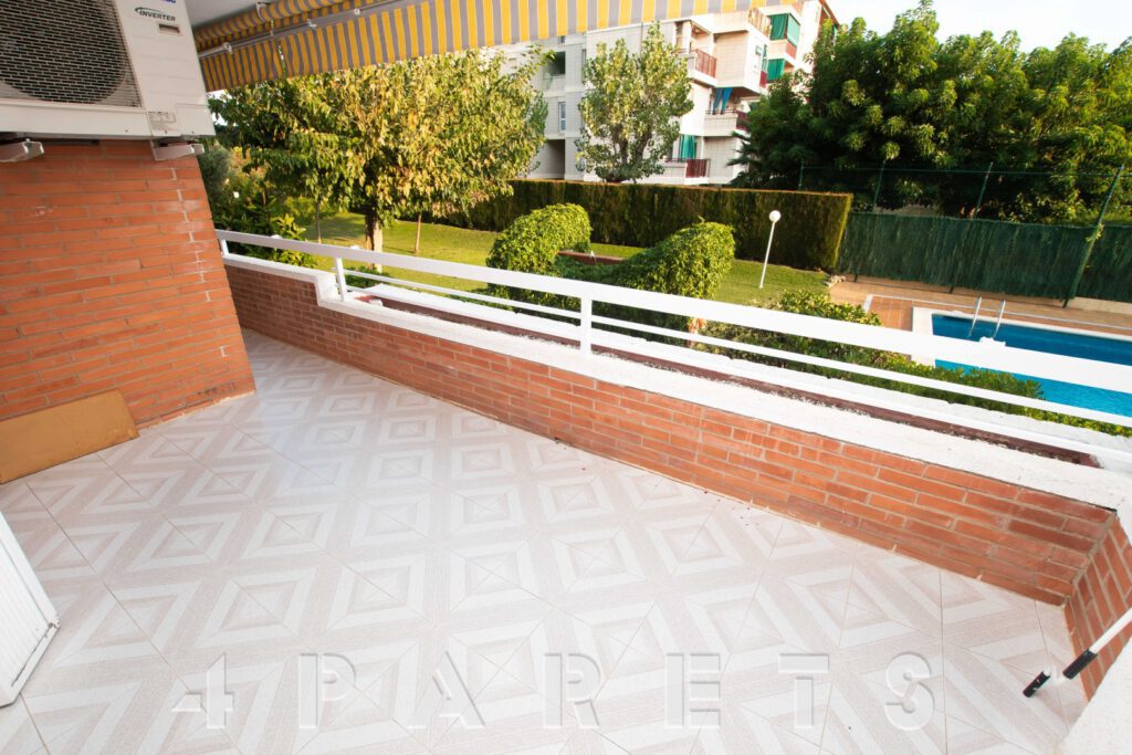 Está distribuido de la siguiente manera: justo entrando accedemos a un recibidor y, de aquí, al salón comedor fácil de equipar y amueblar, el cual tiene salida a una espectacular terraza que orienta a la zona comunitaria con la piscina, tiene capacidad para poder colcar una mesa con sillas.