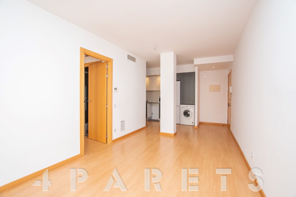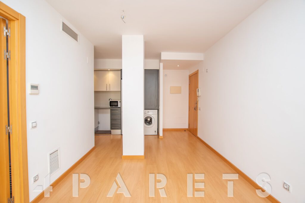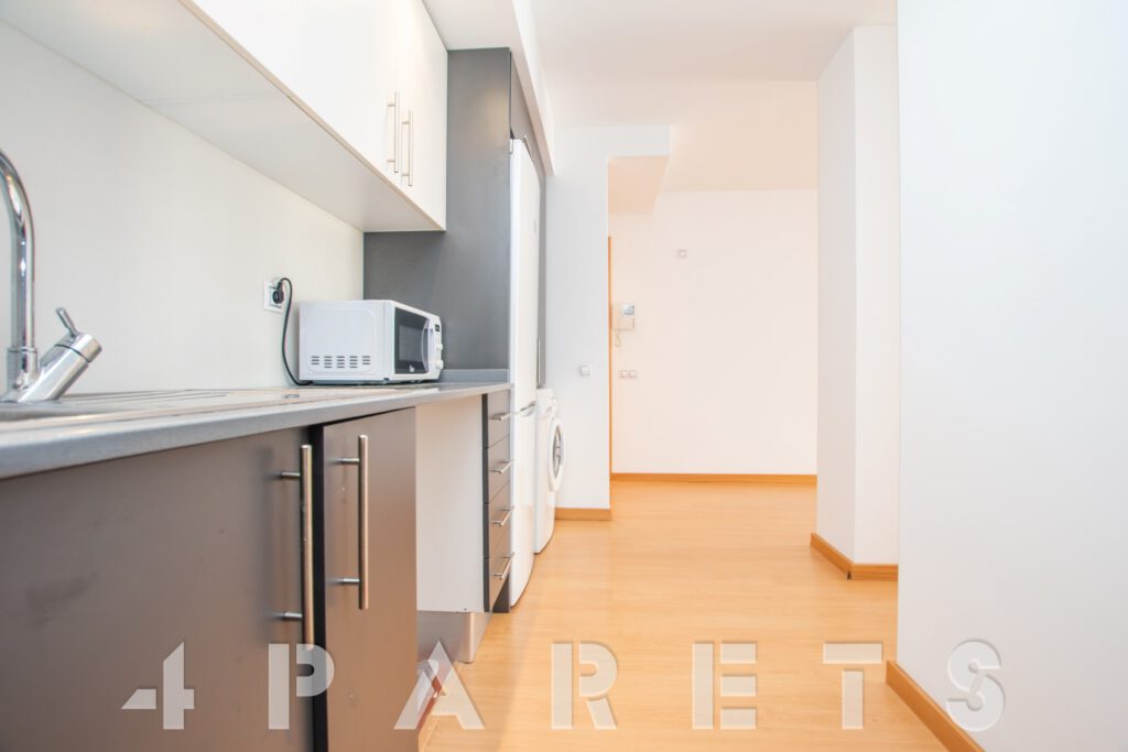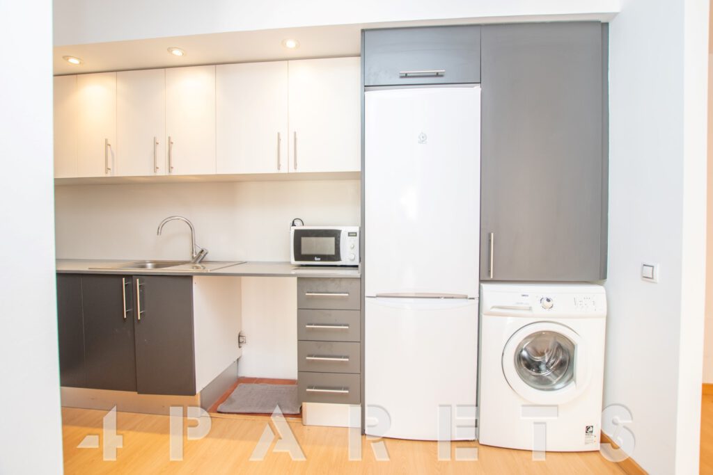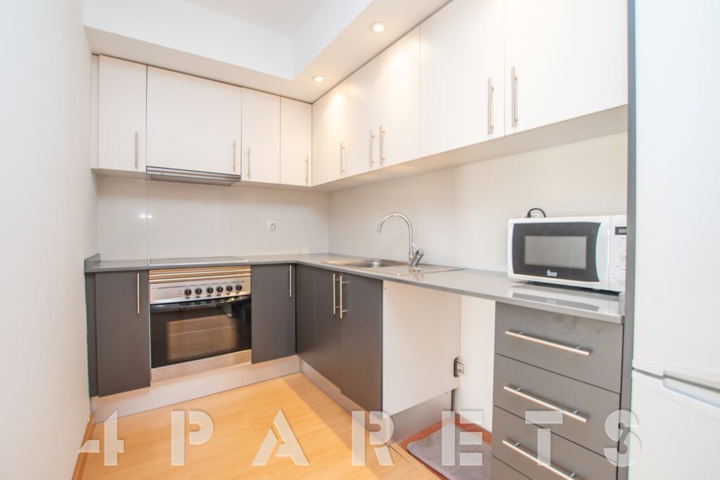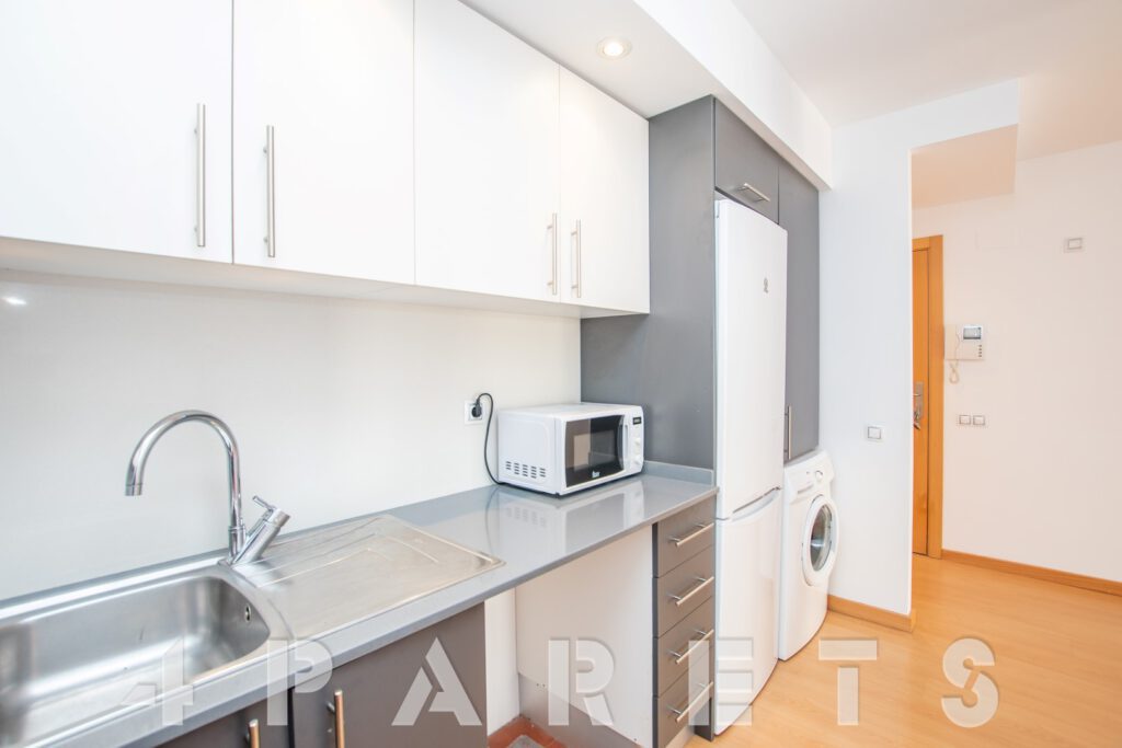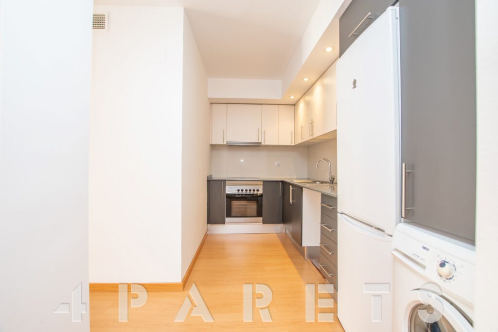 – Entramos al piso mediante un pequeño distribuidor y nos queda a mano de derecha la cocina, abierta al comedor aunque da la sensación de ser prácticamente independiente. Con mucho espacio de almacenaje y viene equipada con vitrocerámica, nevera y lavadora. Acto seguido tenemos la zona de comedor y salón, en dos ambientes y con salida a un balcocinto que también comunica con el dormitorio. Este, es un dormitorio doble, con armario empotrado y con el cuarto de baño incorporado, de tres piezas y con plato de ducha con mampara de cristal.