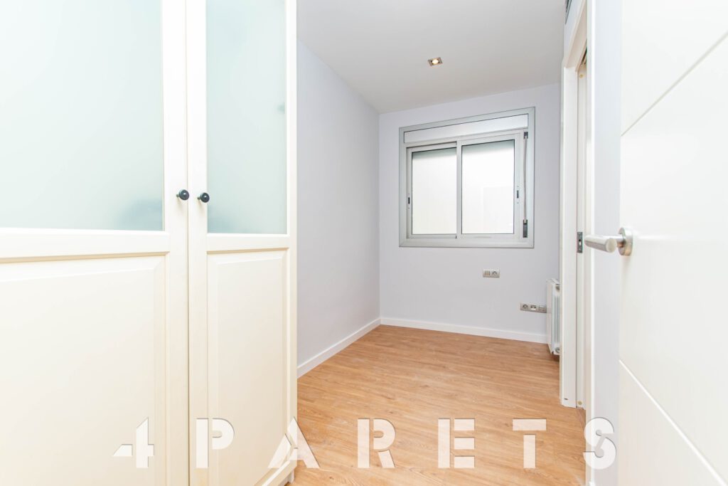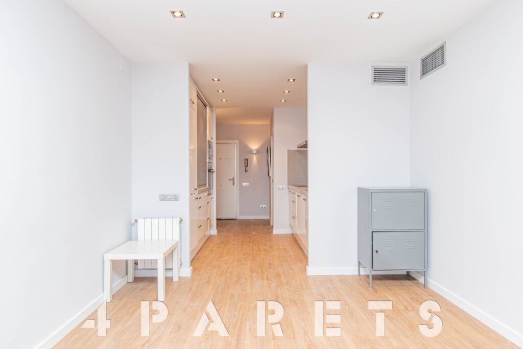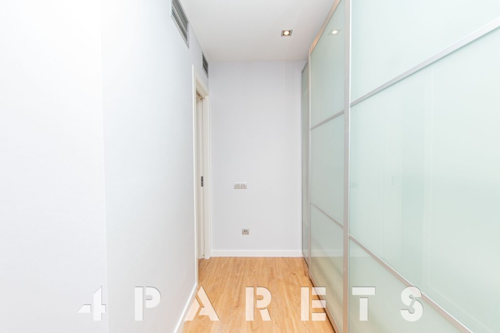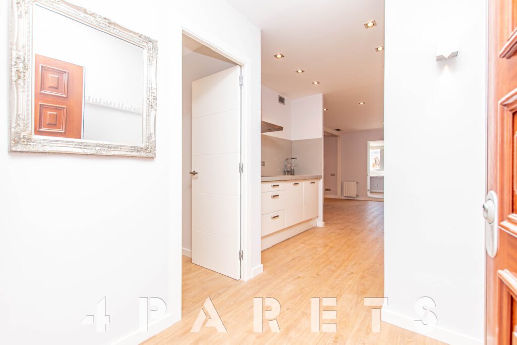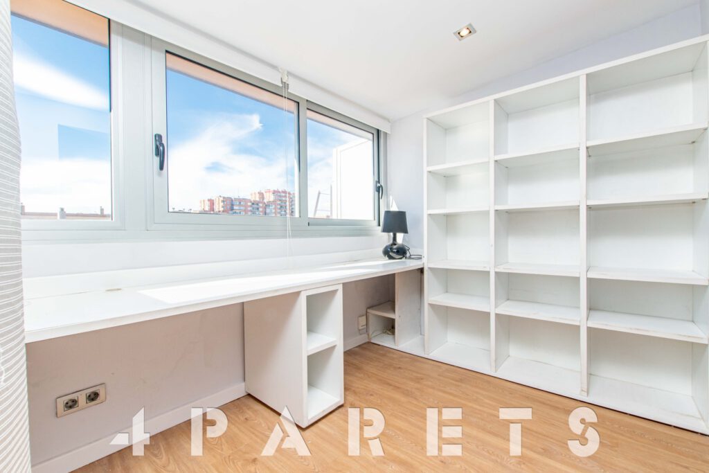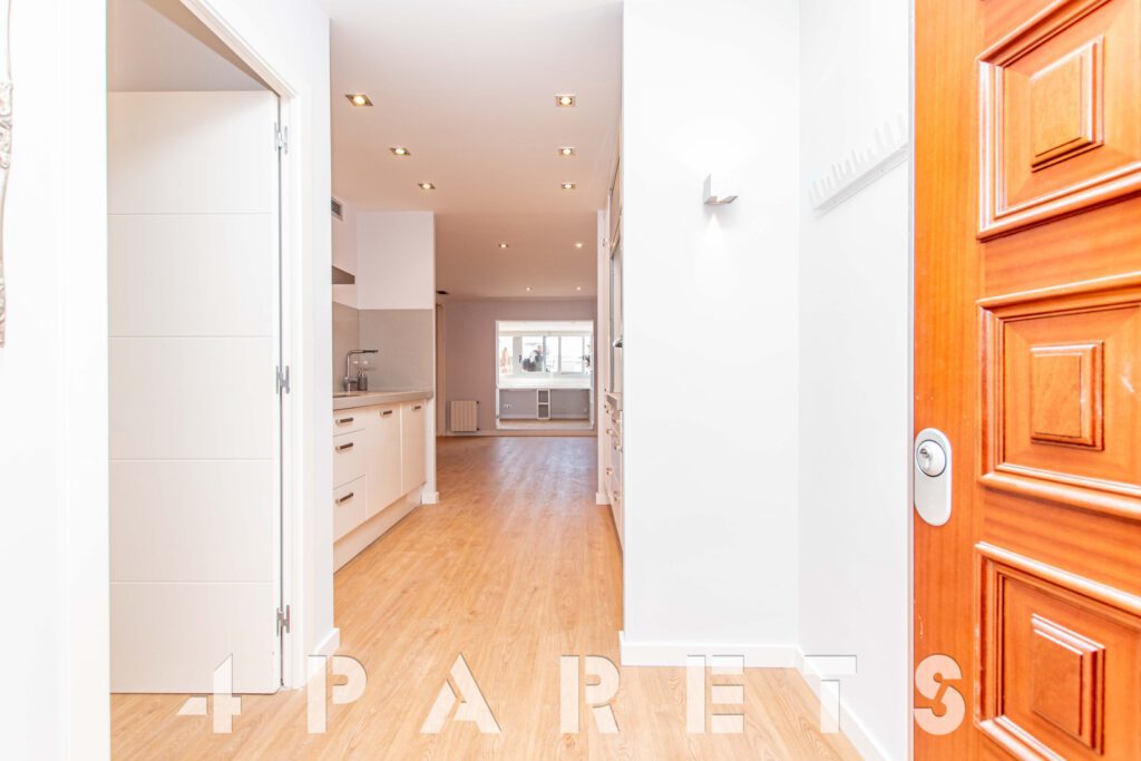 Recibidor de entrada que comunica con varias estancias: a mano izquierda con la habitación secundaria, una habitación individual con la peculiaridad que, desde el interior, tiene acceso directo al baño. Por otra parte, desde el recibidor también accedemos a la cocina, una cómoda cocina a banda y banda, equipada con gran espacio de trabajo, placa vitrocerámica, horno, microondas, lavavajillas y nevera con congelador. Cruzando la cocina entramos al salón comedor, de tipología cuadrada y fácil de distribuir. Desde el salón tenemos paso, por una parte y mediante una impresionante puerta corredera, al dormitorio principal, el cual está equipado con armario y también tiene acceso directo al baño y salida a la terraza. Por otra parte, a una magnífica y luminosa zona de estudio abierta al salón. Un agradable espacio complementario ideal para instalar un punto de estudio o teletrabajo. Este espacio también tiene salida directa a la terraza.