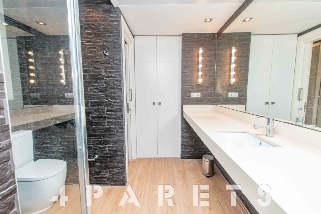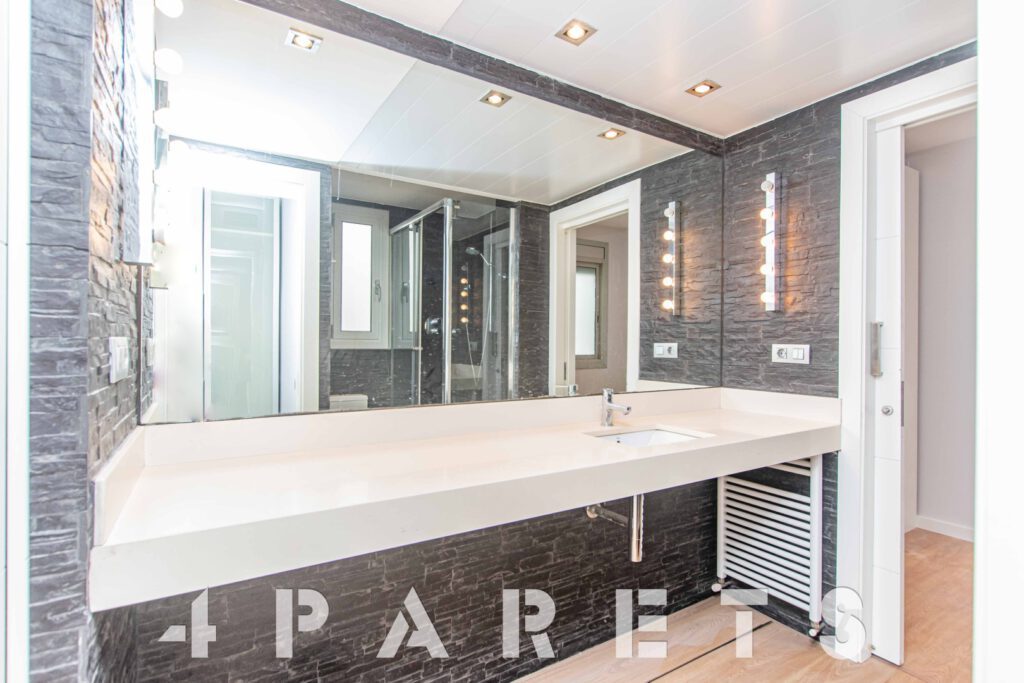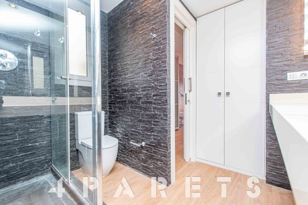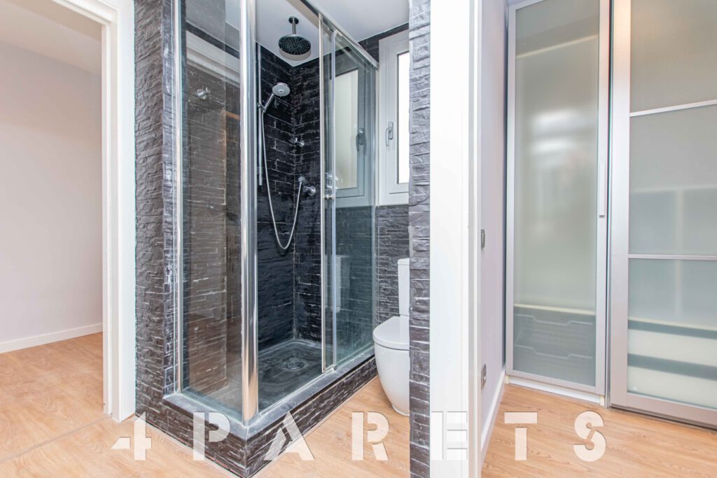 Por lo que respecta al baño, con doble acceso desde cada una de las habitaciones, como hemos comentado anteriormente, está equipado con plato de ducha, un gran lavamanos y un armario empotrado.
