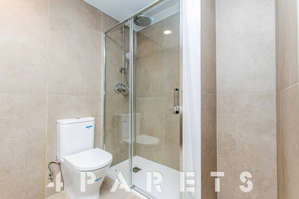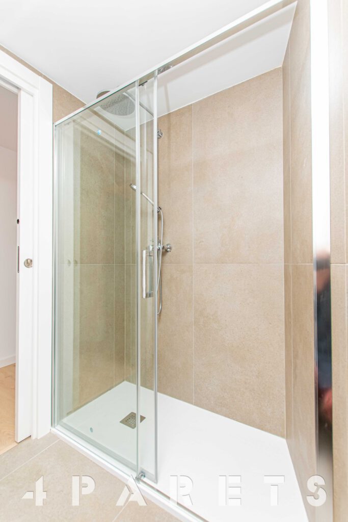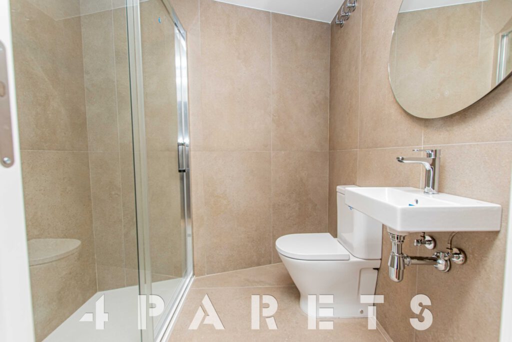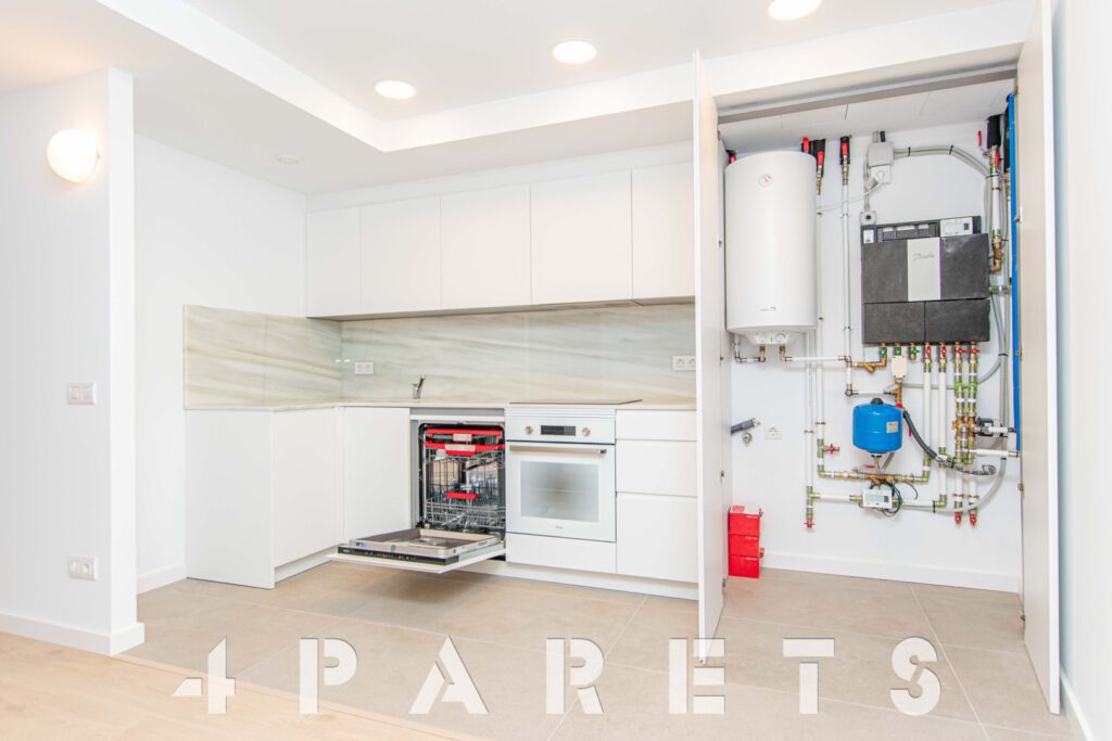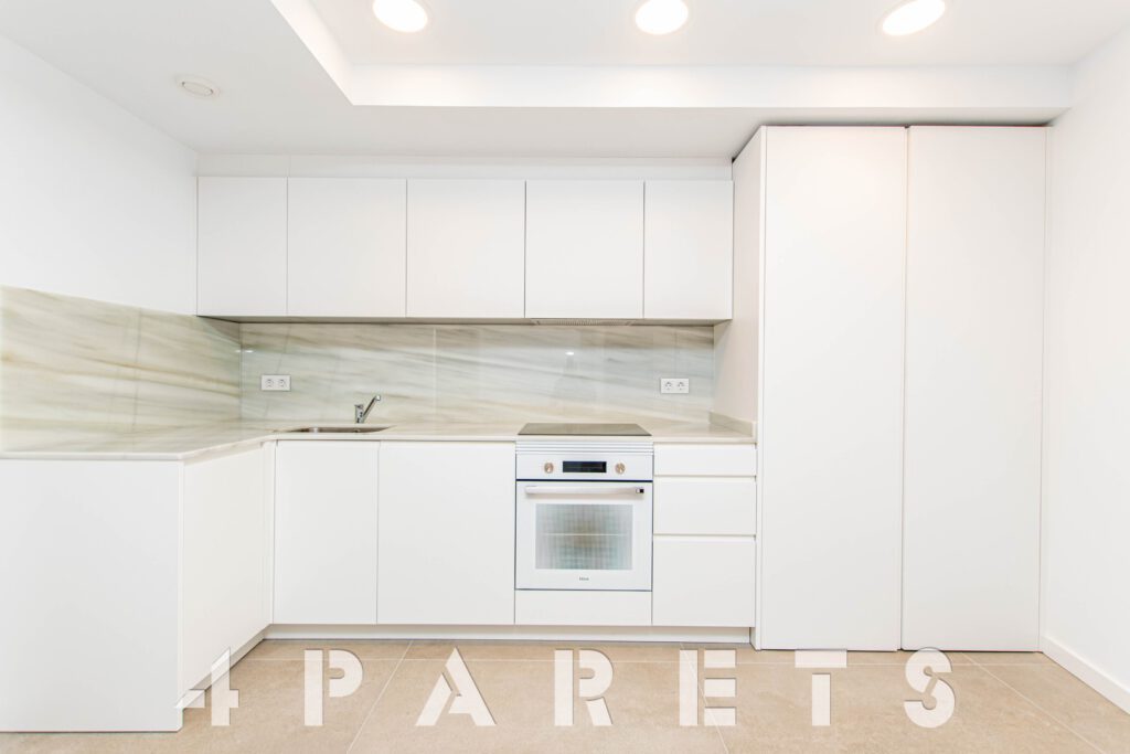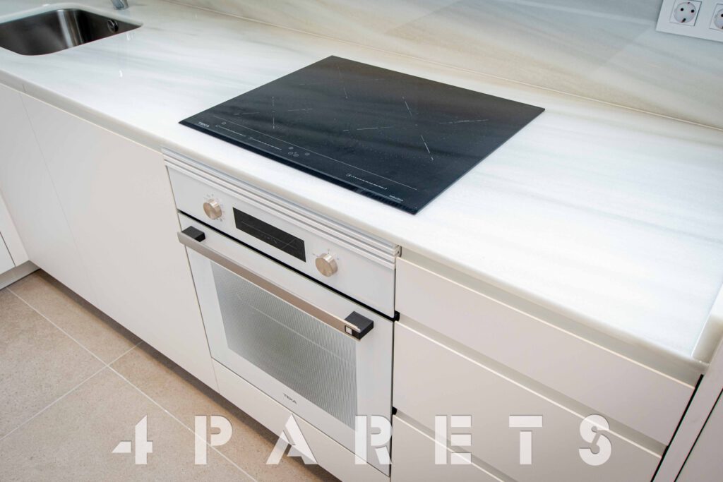 Accedemos directamente a la zona de día, disponemos del salón comedor de tipología cuadrada con un gran ventanal y un amplio balcón, un espacio interior fácil de distribuir, comunicado perfectamente con la cocina semi abierta. La cocina, está equipada con placa de inducción y lavavajillas integrado en el mobiliario, a parte del horno, por supuesto. Cuenta con un gran armario donde está ubicado todo el sistema de aerotermia y donde se puede poner la lavadora.