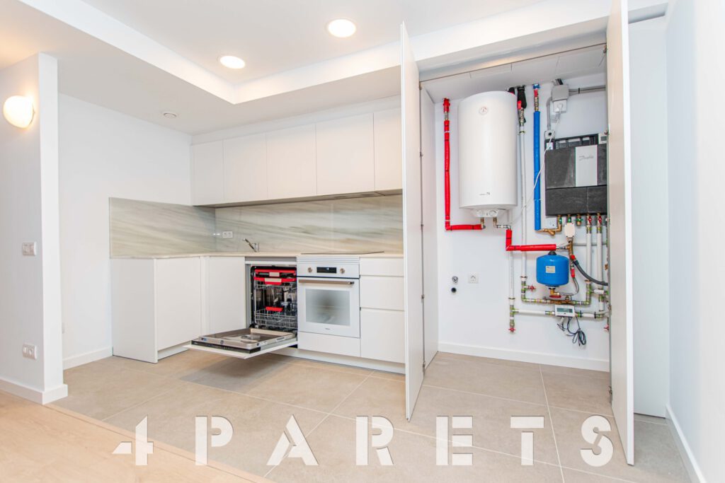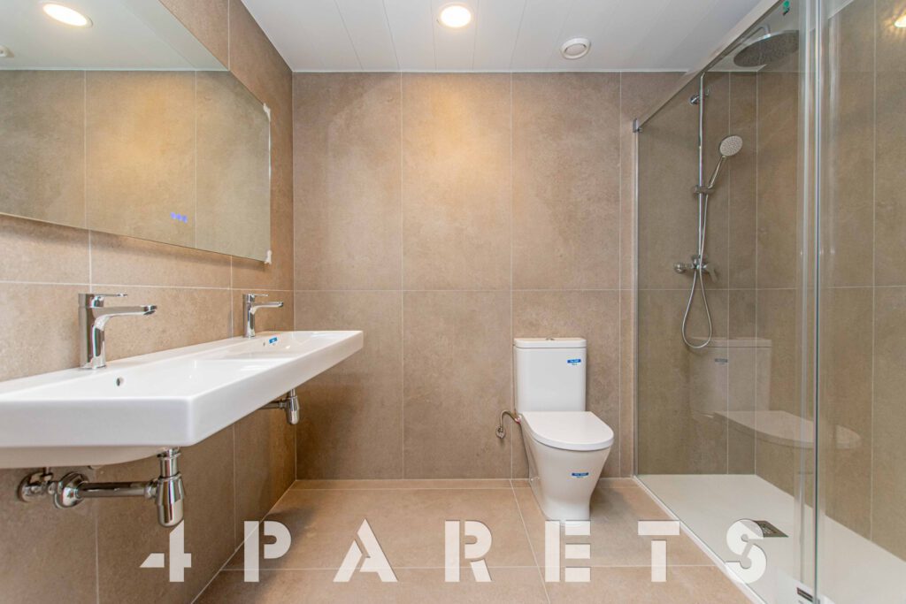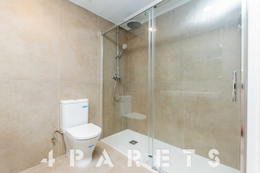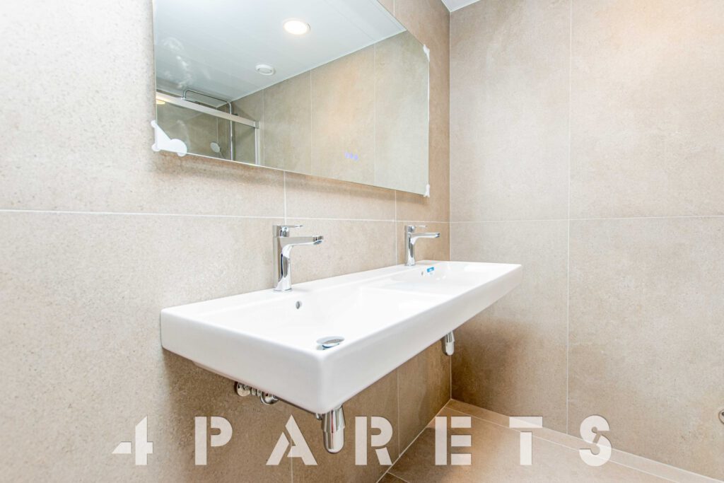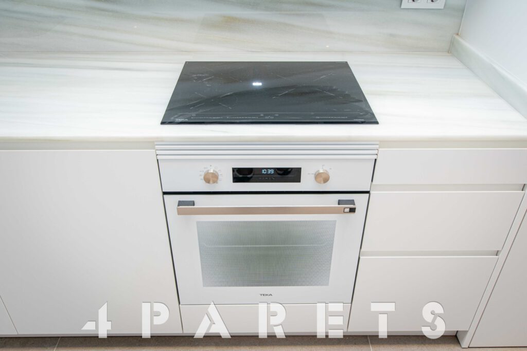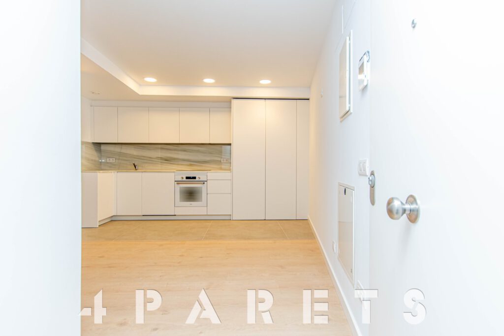 Accedemos directamente a la zona de día, disponemos del salón comedor de tipología cuadrada con un gran ventanal y una gran terraza que dará mucho juego durante todo el año, un espacio interior fácil de distribuir, comunicado perfectamente con la cocina semi abierta. La cocina, está equipada con placa de inducción y lavavajillas integrado en el mobiliario, a parte del horno, por supuesto. Cuenta con un gran armario donde está ubicado todo el sistema de aerotermia y donde se puede poner la lavadora.