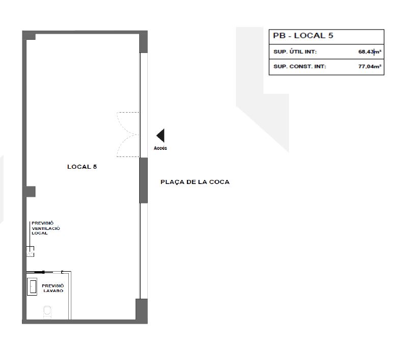 Se trata de un local con una superficie construida de unos 77m2 aproximados, actualmente diáfano, de forma rectangular y con una orientación al este, mucha entrada de luz natural durante todo el día.