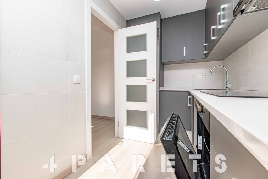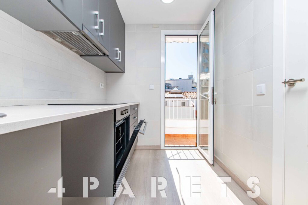 Seguidamente llegamos al otro extremo del piso, donde encontramos la zona de día con un hiper luminoso salón comedor con orientación sureste, una de las más valoradas (mar). Anexa a esta estancia, disponemos de la cocina independiente, equipada con placa de cocción eléctrica, hueco para lavavajillas y mucho mobiliario para almacenaje. Desde la cocina tenemos salida directa al balcón, un agradable y soleado espacio exterior muy tranquilo, ya que no da a a calle, donde ubicar la lavadora y poder tender la ropa.