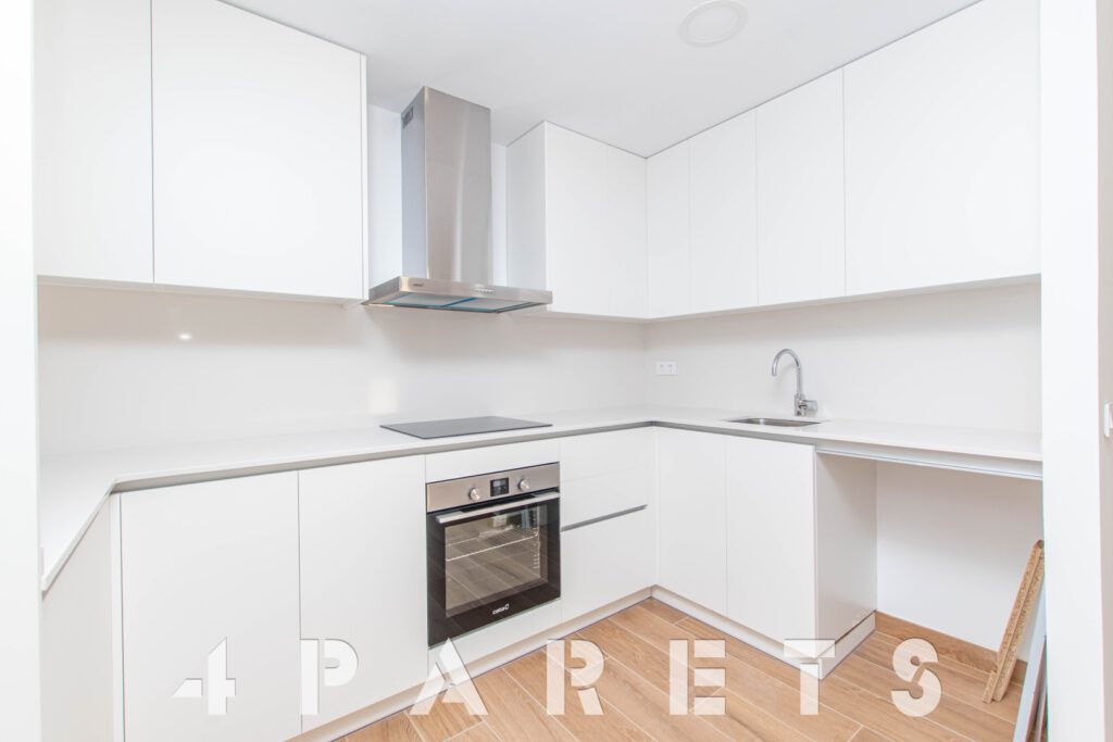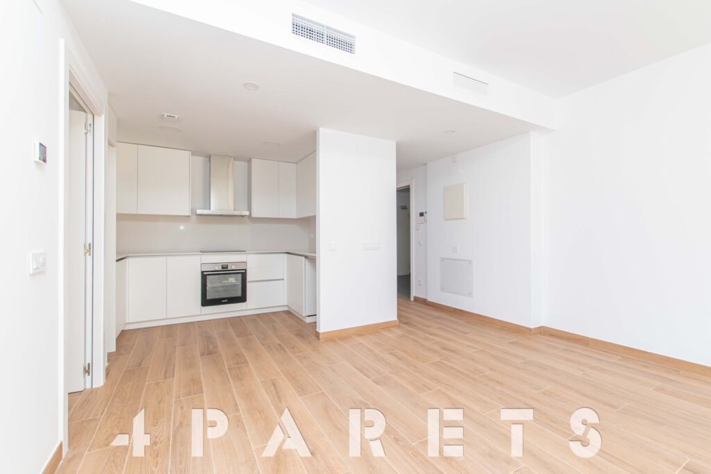 Tal y como entramos en el piso tenemos un pequeño recibidor que nos da paso a la zona de salón comedor, con la cocina abierta, aunque situada a un extremo de la estancia. Desde el salón tenemos salida a la amplia terraza que abarca todo lo largo del piso.