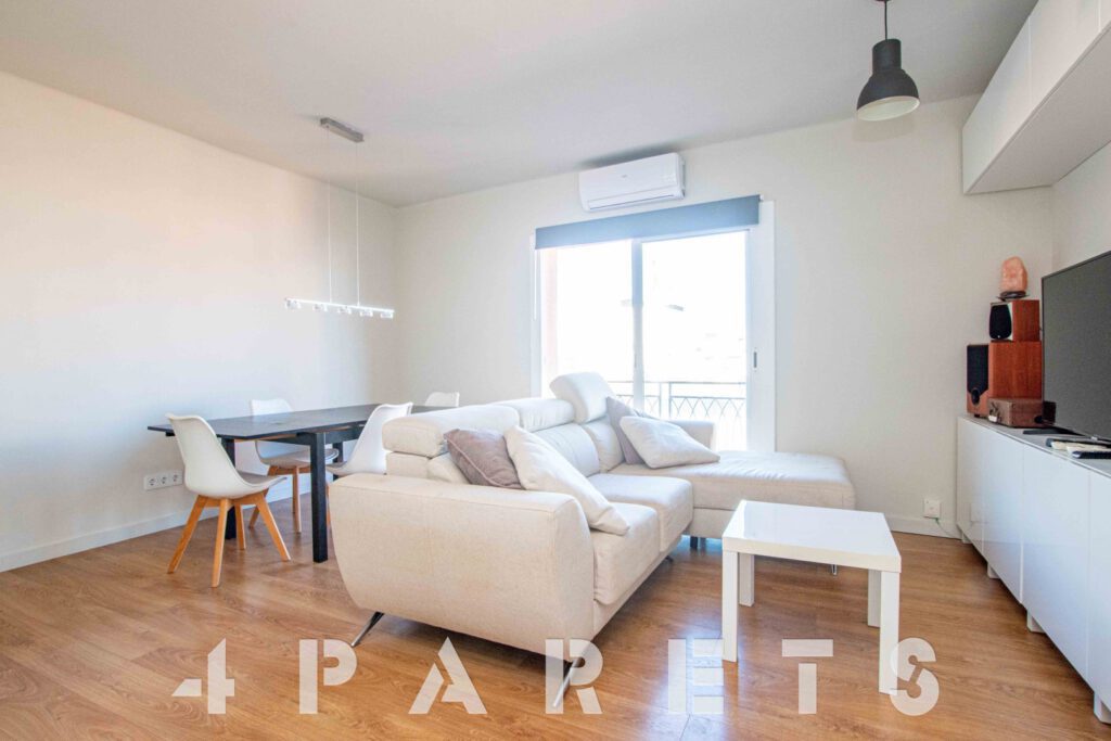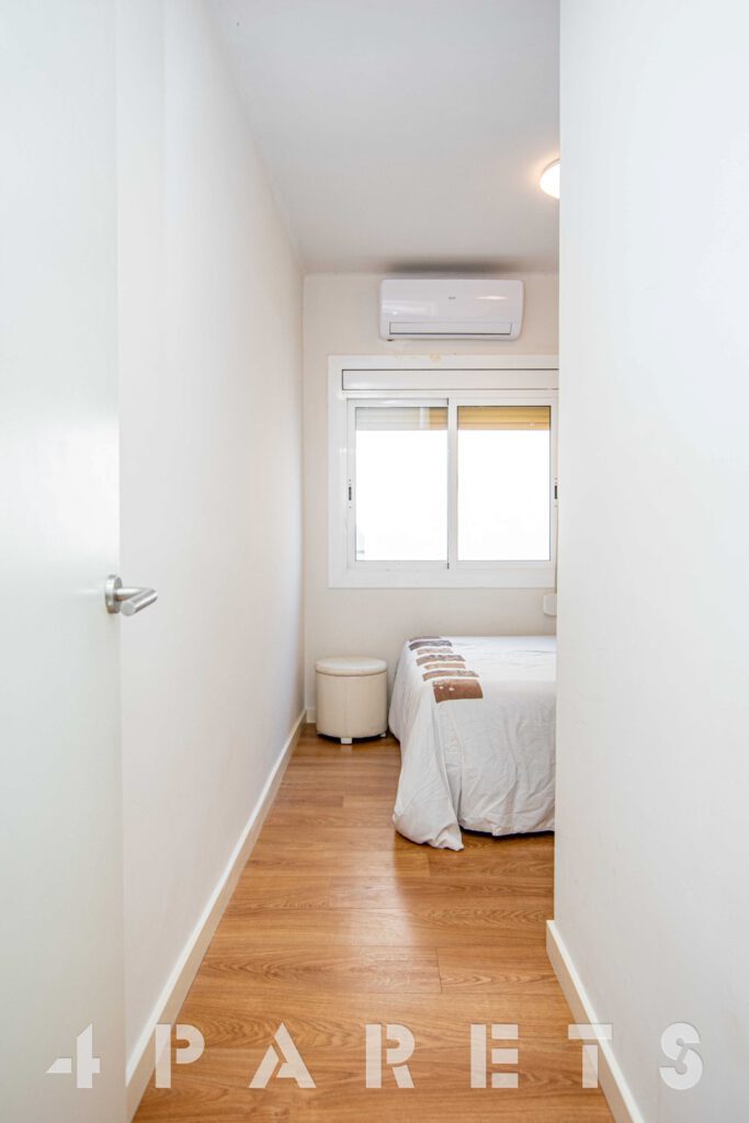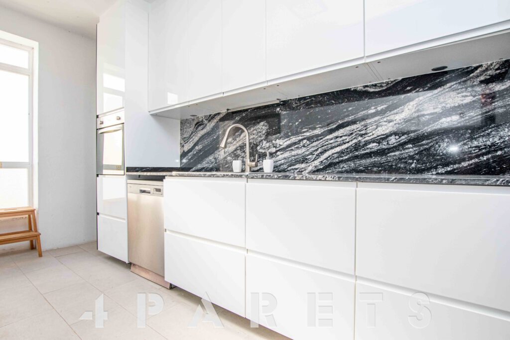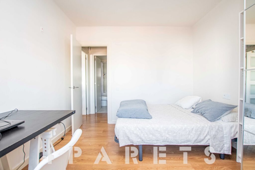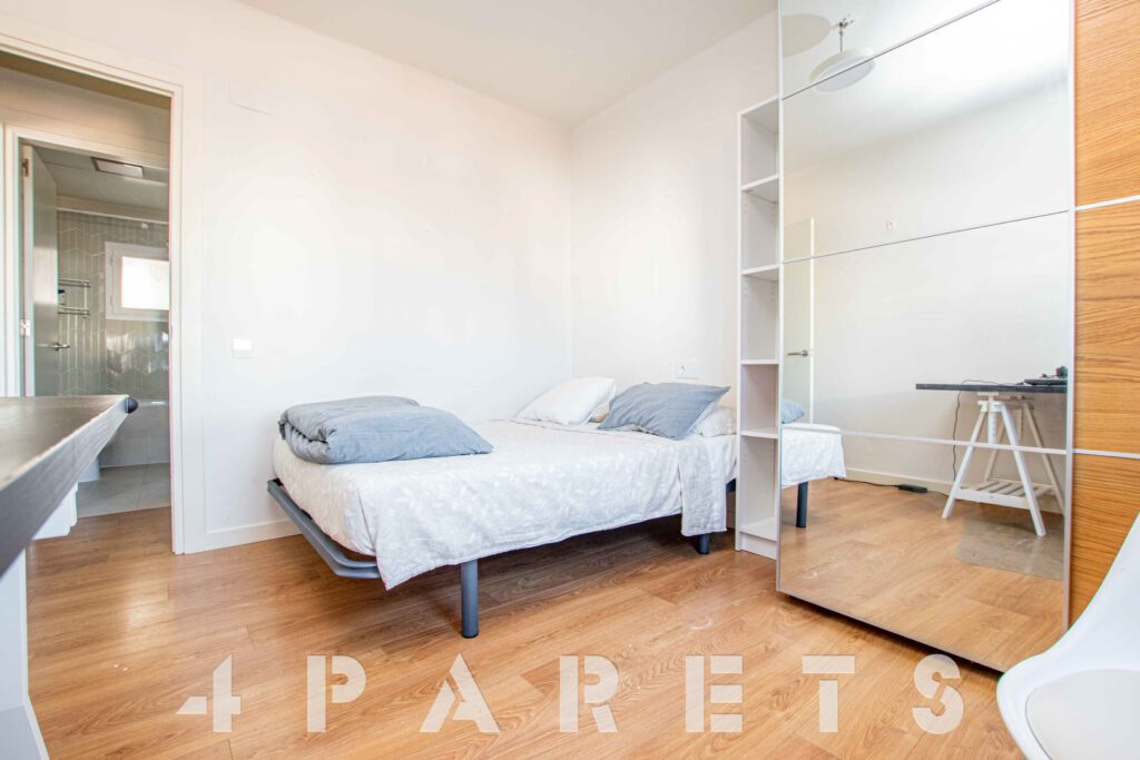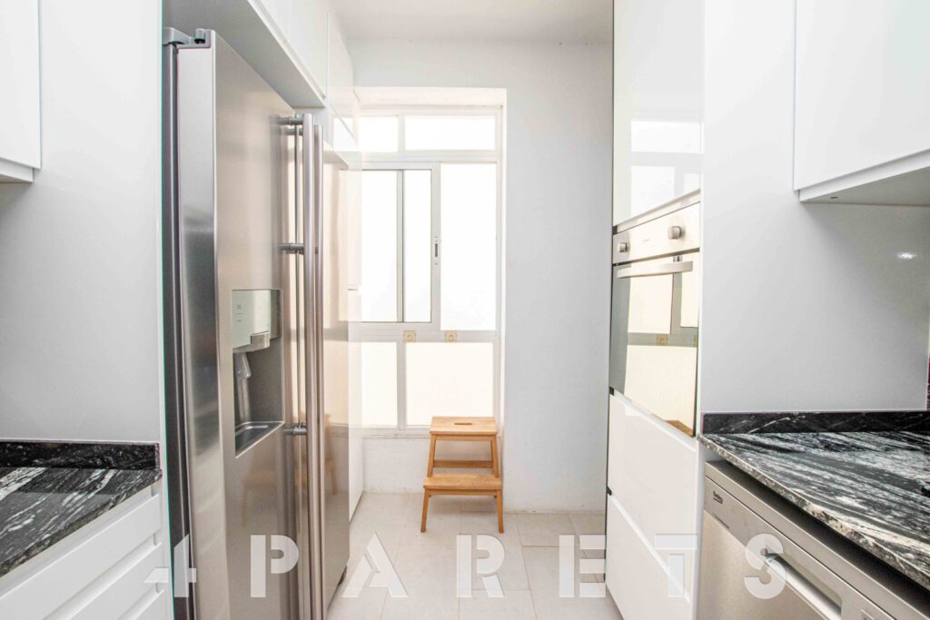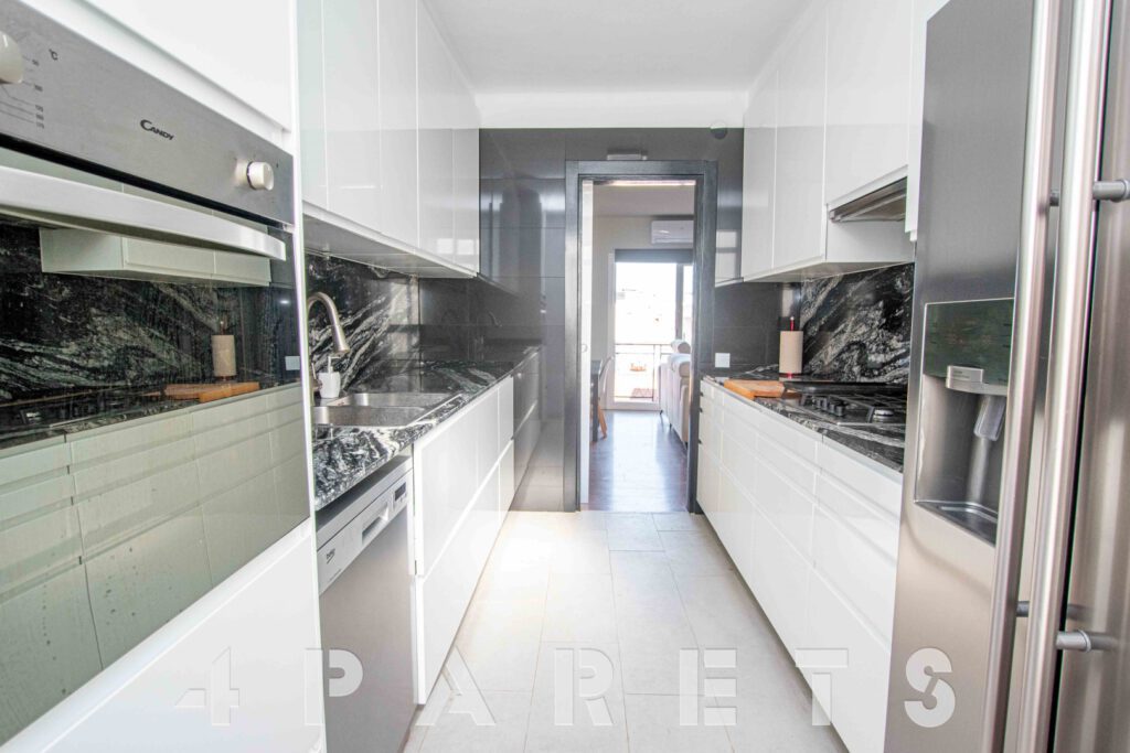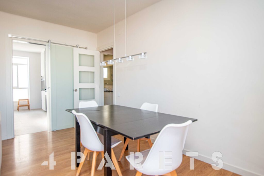 Un recibidor de entrada, a mano izquierda la primera de las cuatro habitaciones, de tamaño individual y con ventilación a la parte posterior del edificio. Acto seguido entramos a la zona de comedor, muy luminosa, de forma cuadrada y con salida a un balcón exterior a la calle. La cocina es independiente al comedor, lacada en blanco, luminosa, con mucho espacio de almacenaje y con un lavadero a parte.