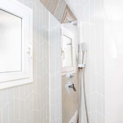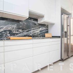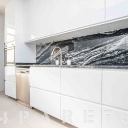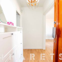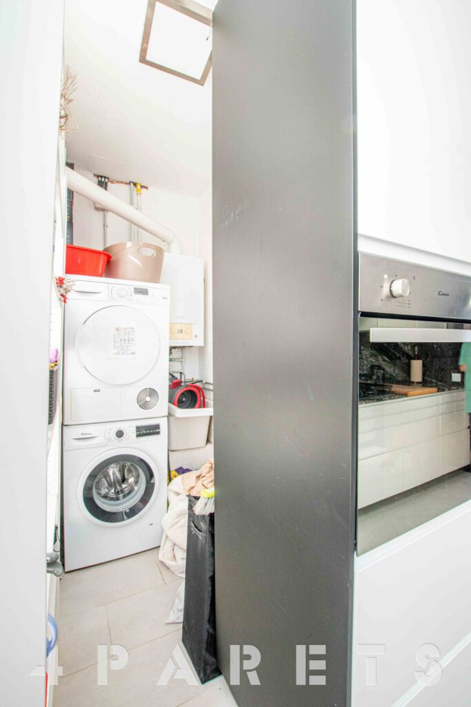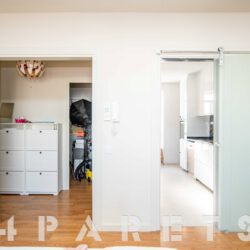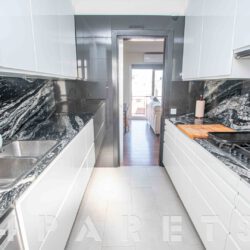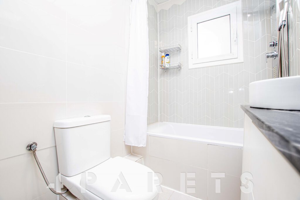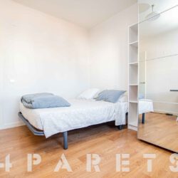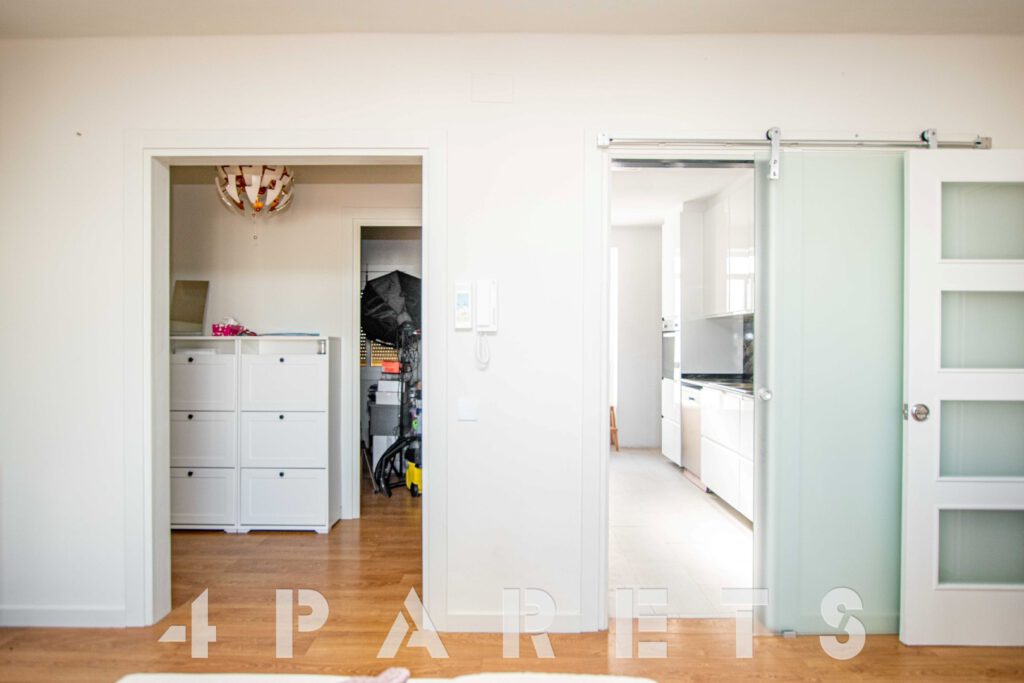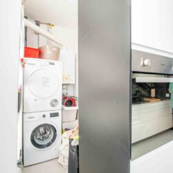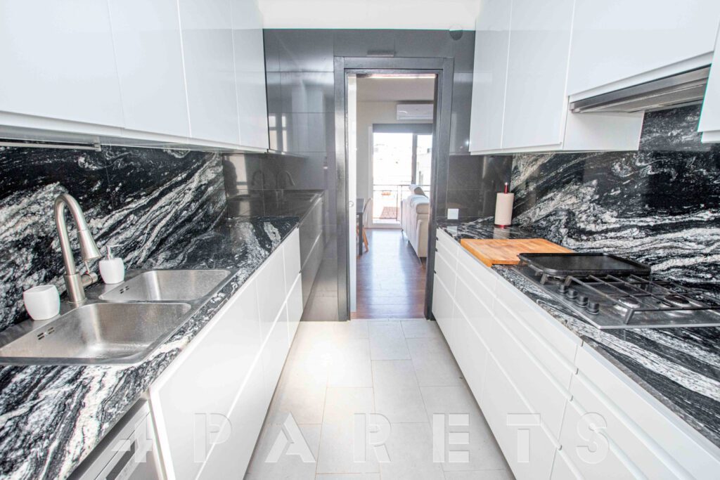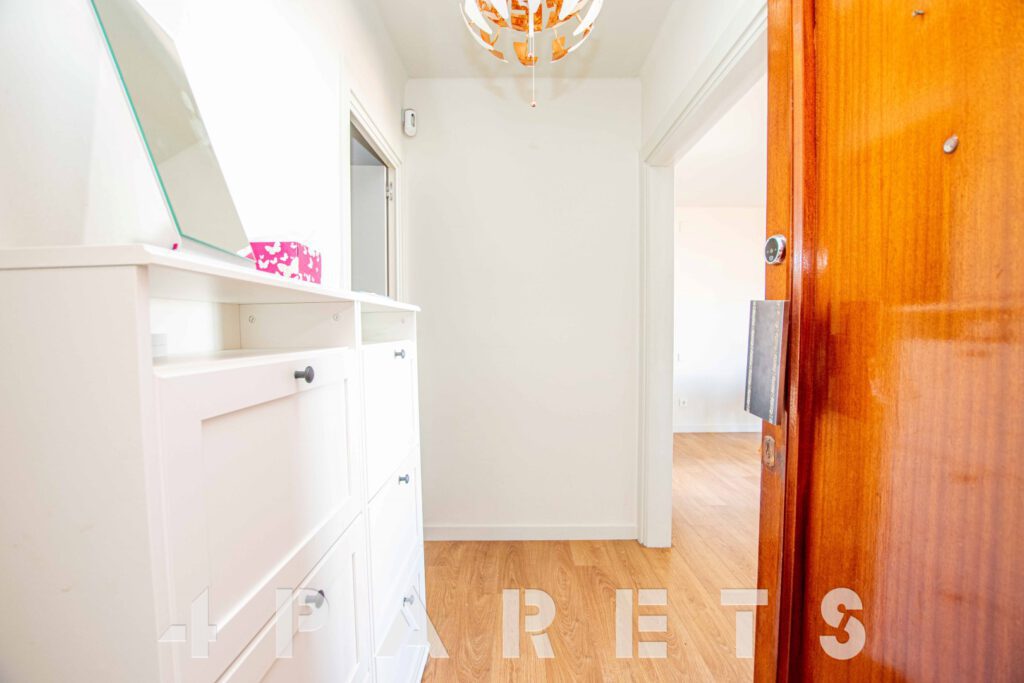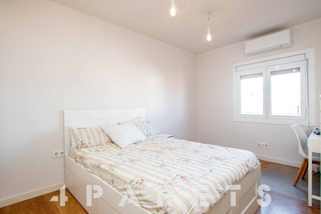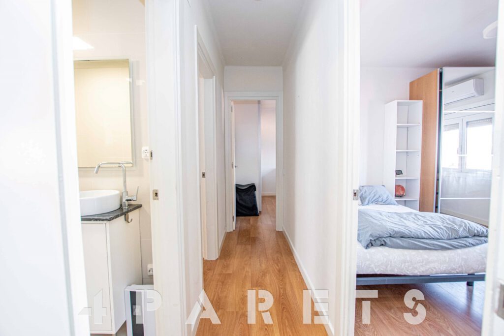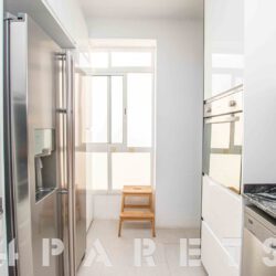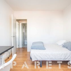 Un recibidor de entrada, a mano izquierda la primera de las cuatro habitaciones, de tamaño individual y con ventilación a la parte posterior del edificio. Acto seguido entramos a la zona de comedor, muy luminosa, de forma cuadrada y con salida a un balcón exterior a la calle. La cocina es independiente al comedor, lacada en blanco, luminosa, con mucho espacio de almacenaje y con un lavadero a parte.