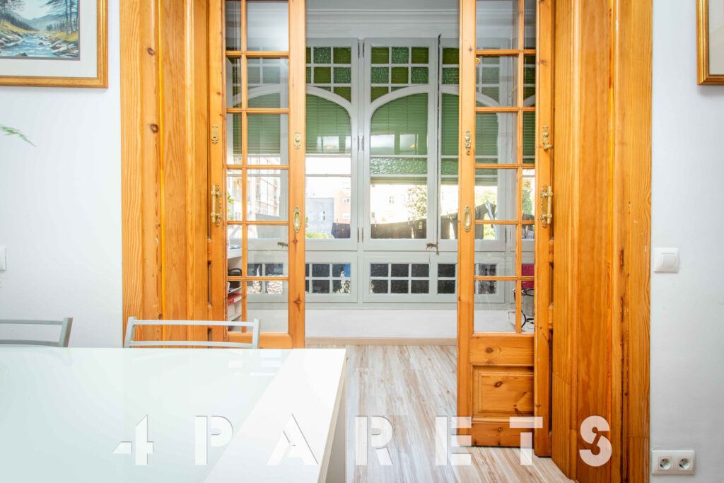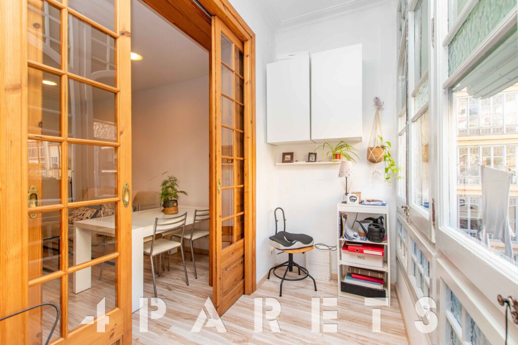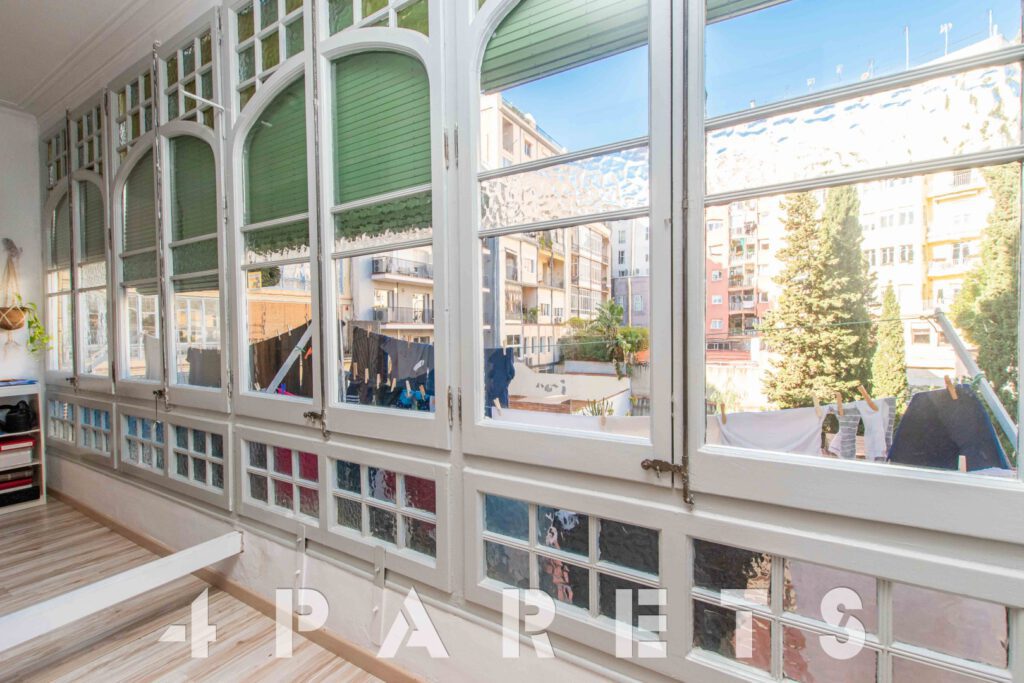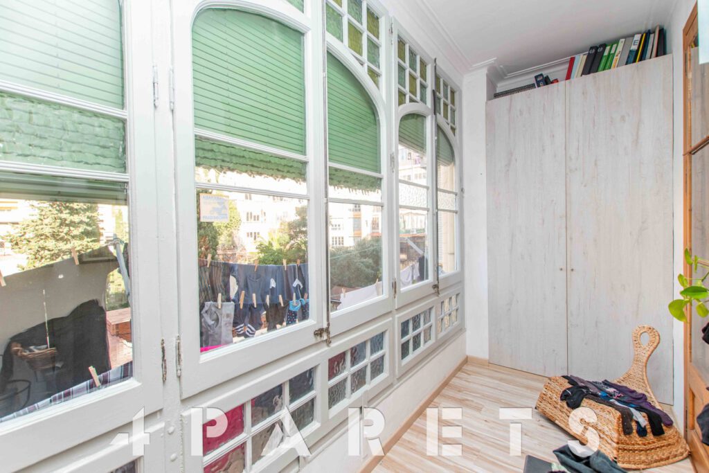 A continuación, nos encontramos con un segundo salón, el cual puede llegar a tener múltiples usos: dormitorio, salón, comedor, zona de juego, zona de estudio, etc. Anexos a esta sala disponemos de dos dormitorios más, ambos dobles y comunicados entre ellos. Por último, en el extremo del piso, podemos disfrutar de una extraordinaria galería muy bien integrada con el interior de la vivienda, equipada con un gran ventanal y orientada al patio de manzana. Ideal para tender la ropa.