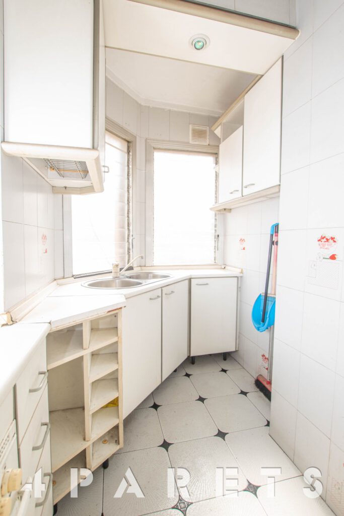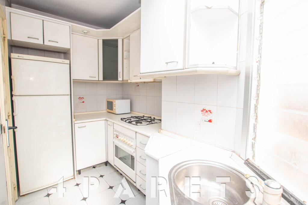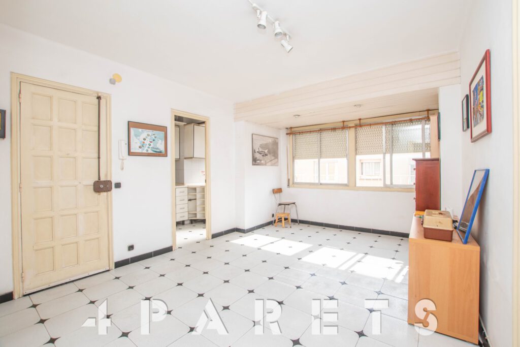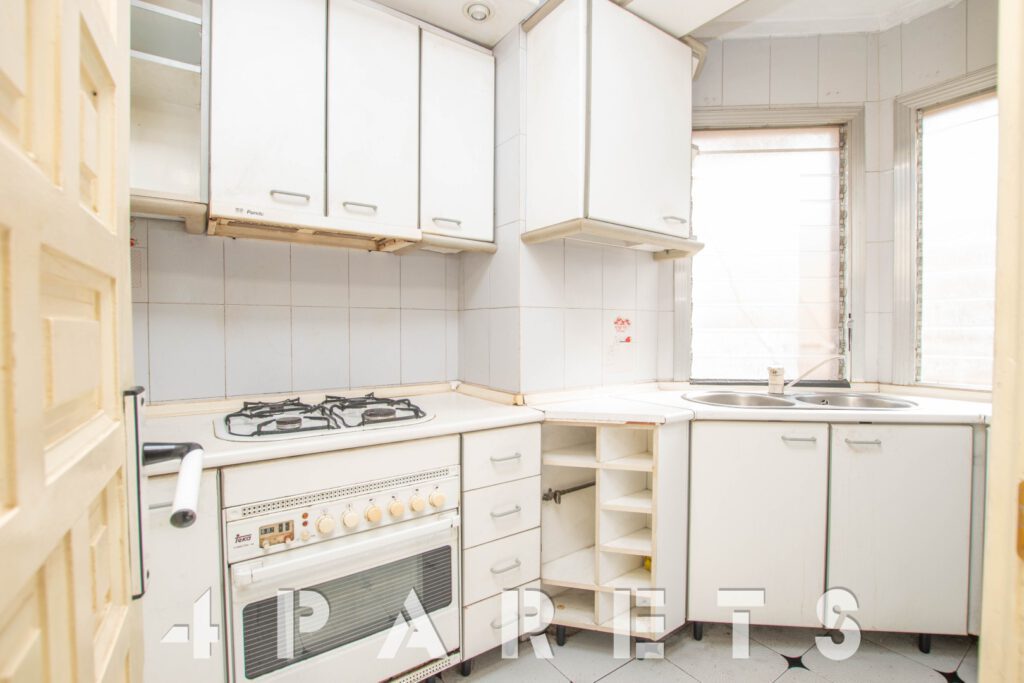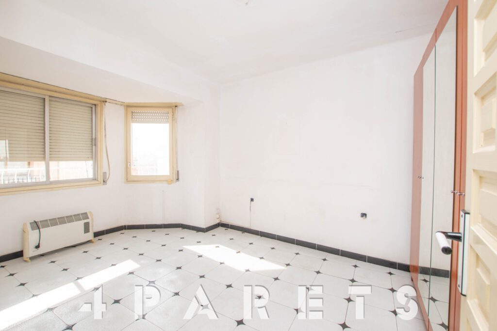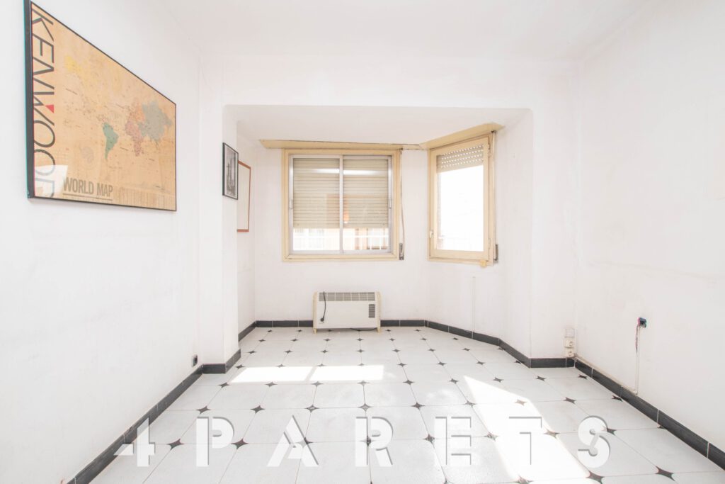 Por un lado, la cocina, con buena capacidad de almacenaje y exterior a la calle. 2 habitaciones, la principal de tamaño más que doble y también exterior, la segunda habitación es individual y ventila a un patio de luces del edificio. Un cuarto de baño, actualmente con bañera.